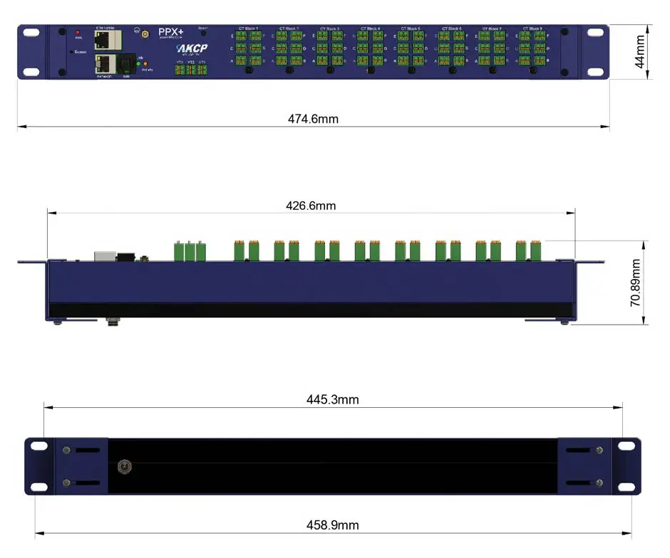 Compatible avec les systèmes monophasés et triphasés, ce dispositif intègre trois entrées de tension, attribuées via logiciel aux groupes de transformateurs de courant (TC) externes, organisés en huit groupes de six. Un capteur de tension externe prévient les risques liés aux hautes tensions. Pour une surveillance économique au tableau électrique, le PPX+ offre des ports Modbus RS485 et BEB pour l’ajout de fonctionnalités via les extensions AKCP.